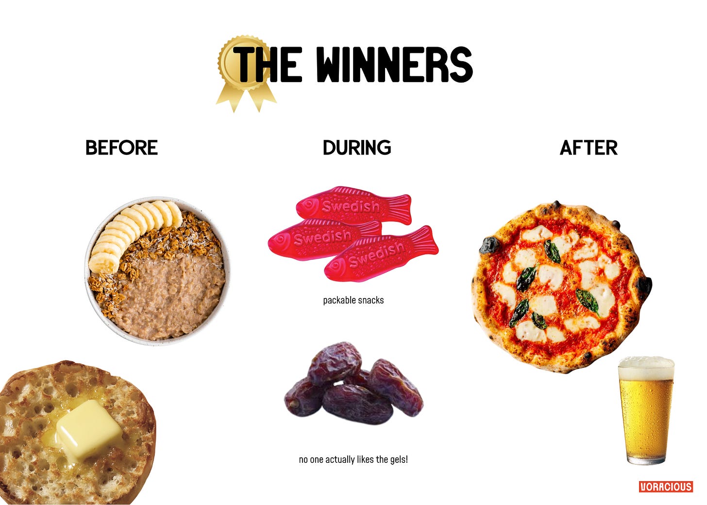 Raz: I don't believe there's any such thing as a "wrong" food. You can burn anything from 500 to 3000 calories on a "normal" run, so your body needs a lot, but focusing on foods rich in protein and salt is wise. Hydration is also obviously very important, so maybe hold off on the third martini!