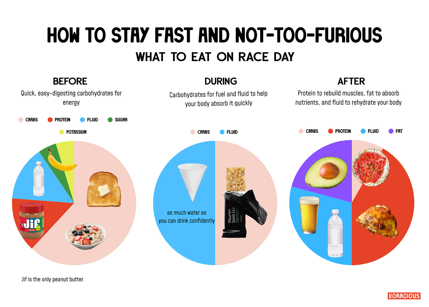 Raz: Pre-race, I keep it really simple. Either plain overnight oats with honey (usually I'll add chia seeds, walnuts, and raisins), or white toast with a peanut butter / Nutella combo. Nothing with too much fiber. Nothing new or different for my body to have to figure out.